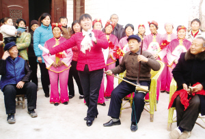 昨日,商水县舒庄乡大朱庄行政村的文化大院里锣鼓喧天,村民们正在这里快乐地打腰鼓、扭秧歌、唱豫剧。去年春季,该村计生协投资购买了腰鼓、服装等,成立了腰鼓队,并请人指导村里的老人、孩子学习打腰鼓、扭秧歌。每到农闲季节或茶余饭后,村民们就来到文化大院自娱自乐。(乔连军 摄)