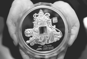 1月15日,北京菜市口百货商场工作人员展示纯银“虎钱”。当天,由中国国家博物馆艺术品开发中心监制发行的1公斤限量纯银“虎钱”上市。据介绍,“虎钱”取自唐朝“开元通宝”的造型,正面为“财神”赵公明骑虎图。