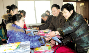 近日,市妇联工作人员和社会爱心人士一行走进淮阳县文化艺术学校,为这里的留守儿童和50名孤儿带去了捐赠的11000元爱心款、近千个书包以及书籍、学习用具等,为孩子们送去了关爱和新年的祝福。图为社会爱心人士为孩子们发放学习用品。(记者 孙安平摄)