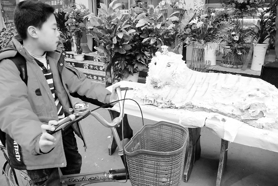 随着虎年脚步的临近,一些商家纷纷出招,借“虎”生财。昨日,市区一蛋糕店制作一个超大的虎型蛋糕,放在店门前,吸引了不少市民驻足观看。 (记者 孙安平摄)