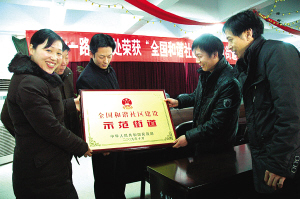 昨日上午,川汇区七一路办事处的工作人员看着刚刚获得的“全国和谐社区建设示范街道”牌匾笑得合不拢嘴。据悉,我省共有15个办事处获得了“全国和谐社区建设示范街道”称号,而川汇区七一路办事处是其中之一。(记者 王映 摄)