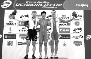 1月23日,中国选手张淼(中)等在颁奖仪式上。当日,在北京国际自盟场地自行车世界杯赛男子1公里计时赛中,张淼以1分02秒173的成绩夺得冠军。