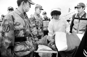 4月22日,救护人员转运玉树灾区危重伤员。当天是玉树发生地震第9天,玉树至西宁航线继续转运危重伤员,为震后救灾搭建空中的生命通道。新华社记者 范长国 摄