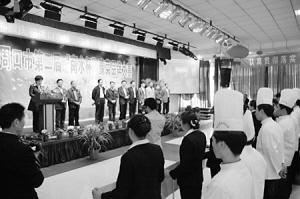 4月23日,由市商务局、市酒店餐饮协会联合举办的河南省第三届豫菜品牌大赛(周口选拔赛)、河南省第五届烹饪技能大赛(周口选拔赛)、第二届面食面点专项技术大赛(周口选拔赛)和周口市第二届“商水杯”创新豫菜品牌大赛在商水宾馆开幕。经过激烈的比赛,至尊黄牛宴、大麻团、金汤醋溜鸡、水乡稻草肉、平脆皖鱼等15个创新菜获得一等奖,15个创新菜获得了二等奖,商水宾馆获得了最佳组织奖。(记者 朱虹 摄)