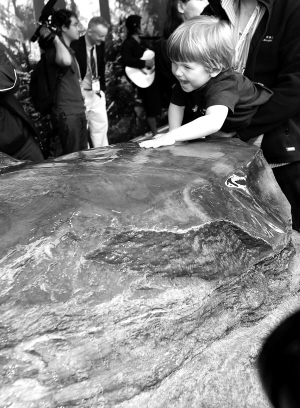 新西兰馆重达1.8吨的墨绿色玉石 4月29日,一名小朋友在触摸新西兰馆的“镇馆之宝”——一块重达1.8吨的墨绿色玉石。新西兰馆的前厅摆放有一块重达1.8吨的墨绿色玉石。这是毛利人的尊崇之物,每个参观新西兰馆的游客将被邀请来触摸这块玉石。新华社发
