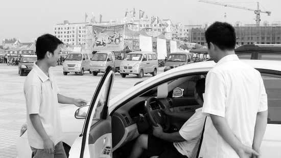 7月30日,几位群众在商品博览会上了解汽车行情。当日,由太康县委宣传部和某公司联合举办的商品博览会在太康县人民广场举办,吸引很多群众前来参观。(记者 刘俊涛 摄)