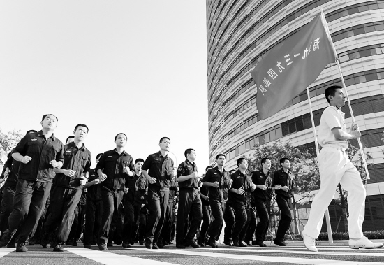 8月1日,海军长跑方队参加军民长跑活动。 当天,上海市举办庆“八一”军民长跑健身活动。本次活动以“与世博同行,为世博添彩”为主题,吸引2000余名长跑爱好者参加。 新华社发(郭长耀 摄)