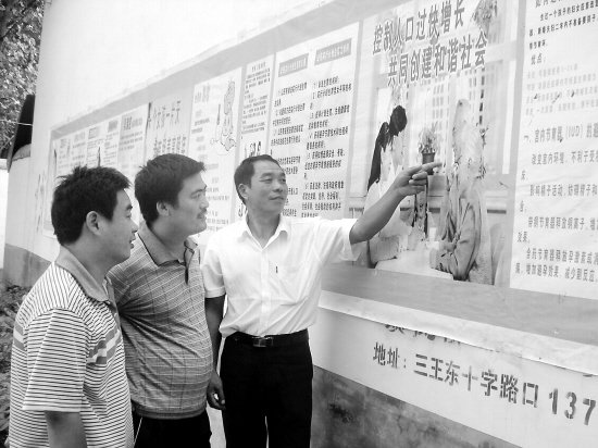 今年以来,太康县老冢镇孟庄村采取得力措施,用举办知识讲座、开辟计划生育宣传栏、制作婚育知识手册等多种形式,在群众中宣传计划生育政策和法规,进一步增强了群众实行计划生育的自觉性。图为该村干部利用计划生育宣传栏给村民讲解生育知识。 (记者 孙安平 摄)