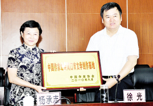 本报讯 (记者 吴继峰 王艳) 8月11日上午,中国作家协会周口市文学创作基地正式建立,中国作协党组成员、书记处书记、主席团委员杨承志代表中国作家协会为周口市文学创作基地授牌,市长徐光接牌。