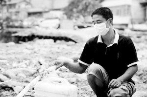 8月11日,在甘肃省舟曲县城,受灾居民在一口新打的水井接水。 新华社发