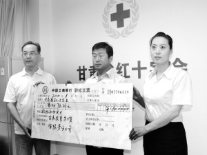 社会各界向舟曲灾区捐款 8月11日,甘肃农垦宾馆向和十字会工作人员展示捐款支票。舟曲特大山洪泥石流灾害发生后,社会各界通过甘肃省红十字会向灾区捐款捐物,表示对灾区的关心和祝福。新华社记者 王武彬 摄