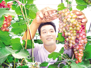 商水县练集镇朱集行政村共产党员朱和平正在党员示范园区采摘葡萄。近来,在创先争优活动中,该县积极引导党员开发短、平、快特色种植项目,带动群众共同致富。(刘飞 张慧 摄)