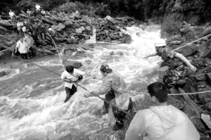 8月19日16时许,新乡市辉县八里镇回龙村突遭暴雨,泥石俱下,道路被埋,通讯中断,正在山里的126名游客被困山中,情形万分危急。市消防支队接警后,迅速出动赶赴现场,经过现场勘察,消防官兵通过结绳搭建生命通道、跳入激流用身体组成人墙等方式进行营救,历经6小时,成功将126名游客疏散到安全地点。新华社发(郭抗抗 摄)