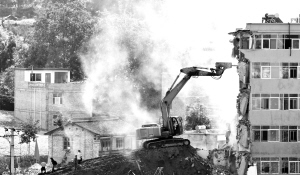 8月20日,随着舟曲救援工作的结束,甘肃舟曲灾区开始动用大型工程机械,拆除因山洪泥石流造成的危房,为复建做准备。 新华社记者 刘彬 摄