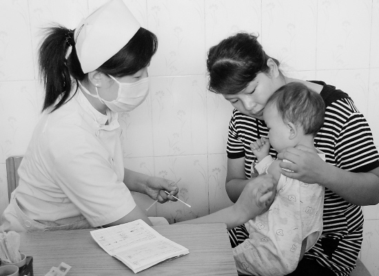 昨日,一位母亲带孩子到市防疫中心打麻疹疫苗。11日,我市适龄儿童麻疹疫苗强化免疫活动正式开始。10天内,全市8月龄到14岁儿童将免费接种麻疹疫苗。(记者 孙安平 摄)