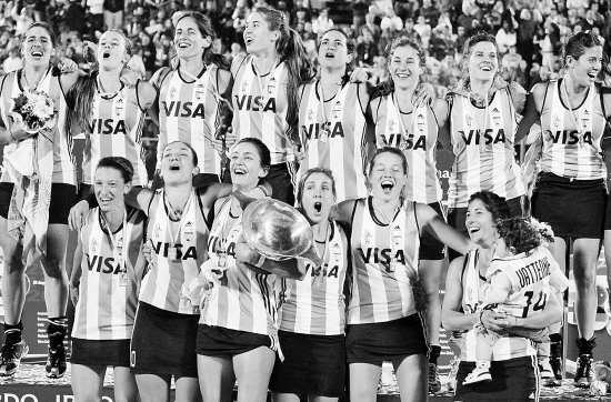 9月11日,阿根廷队球员在颁奖仪式上庆祝胜利。当日,在第12届女子曲棍球世界杯决赛中,阿根廷队以3比1击败荷兰队夺得冠军。 新华社发(亚历杭德罗·亚丘摄)