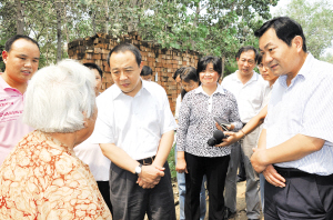 虽然时间过去了一周,河道里的水位已经有所下降,但田野里的许多庄稼仍浸泡在水里,村庄里和房前屋后都是成片成片的积水。在太康县杨庙乡后街村,毛超峰来到村民秦学忠倒塌的房屋前,仔细询问他家有人受伤没有,房子倒塌后吃住怎么办,家里的财产抢救出来没有……秦学忠说,家里人都很安全,但是房子倒了,麦子被水泡了。毛超峰对他说:“相信在党委、政府的帮助和你们的努力下,一定能尽快恢复生产生活,重建家园。”听说五保老人秦玉金的房子倒塌了,目前暂时住在亲戚家中,毛超峰不顾道路泥泞前去看望。见到秦玉金后,毛超峰关切地询问老人有没有吃上饭、住得怎么样。得知老人生活有保障,县乡有关部门正在积极想办法帮助老人重建房屋后,毛超峰满意地点点头。他强调,各级各部门要做到心随责走、责随职走,以强烈的责任意识和对群众的深厚感情,把抗灾救灾工作作为一项十分紧迫的任务,统筹协调,精心组织,采取各种措施,把各项救灾工作做好。各级民政部门要多深入群众,对受灾人数、灾情程度、救灾途径做到心中有数;要积极向省里汇报受灾情况,争取得到更多的救灾支持。