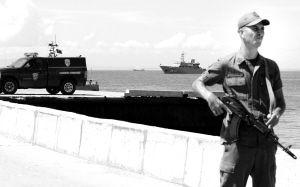委内瑞拉一架直升机坠毁2死5伤 9月14日,在委内瑞拉东部玛格丽特岛的军事基地,士兵持枪警戒。当地时间14日晨7时(北京时间14日晚7时30分),委内瑞拉国防军一架直升机与委内瑞拉武装部队一艘战舰相撞,造成2人死亡,5人受伤。 新华社发