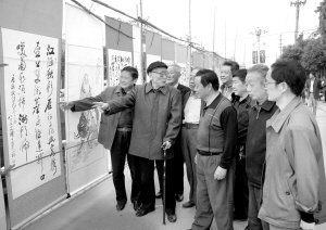 为迎接国庆61周年和重阳节,9月27日,鹿邑县举办了老年书画展览,共有60余位中老年书法家、国画家和爱好者的160多幅作品展出。当天上午观展群众2600多人次。图为年近百岁的全国书法家潘又泉老先生在现场点评书画作品。(本报通讯员 摄)