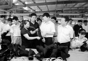 近日,鹿邑县人大常委会主任王顺利带领人大代表在台资企业——祥龙鞋业公司了解生产情况。国庆来临,该县人大常委会积极组织部分省、市、县人大代表视察该县“双十”工程实施情况,感受锐意进取给鹿邑带来的新发展、新变化。(刘雯 孙永红 摄)
