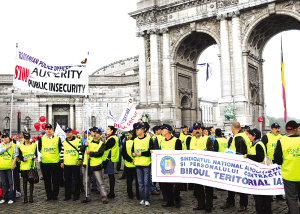 欧洲工会组织在布鲁塞尔举行大规模示威游行 9月29日,来自罗马尼亚的警察代表手持标语在比利时首都布鲁塞尔的“五十周年公园”参加游行。当天,欧洲工会组织在布鲁塞尔举行大规模示威游行,反对增加税收和削减公共开支的经济紧缩措施,要求优先保障劳动者的工作岗位,减少失业率。 新华社记者 张伟 摄