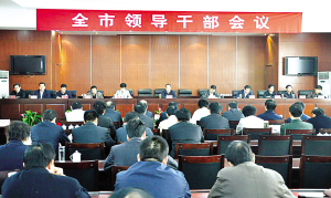本报讯 (记者 李凤霞 吴继峰) 10月26日,市委召开全市领导干部会议,传达贯彻党的十七届五中全会精神和省委常委扩大会议精神,结合我市实际,研究贯彻落实措施。市委书记毛超峰主持会议并作重要讲话。他强调,全市各级党员领导干部要认真学习、深刻领会、切实贯彻党的十七届五中全会精神,自觉遵循发展规律,牢固树立科学发展理念,树立群众观点和良好作风,不断提高领导经济社会发展的能力和水平。