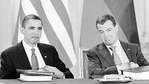 图为获得二等奖的作品《签字后的表情》。2010年4月8日,在捷克首都布拉格,美国总统奥巴马(左)和俄罗斯总统梅德韦杰夫签署新的核裁军条约后收起签字笔时面露相似表情。 新华社记者 武巍 摄