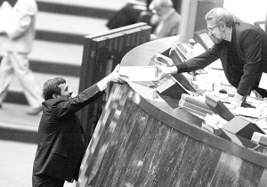 右图为获得三等奖的作品《伊朗总统向议会递交下一个年度预算》。 2010年1月24日,在伊朗首都德黑兰,伊朗总统艾哈迈迪-内贾德(左)向伊朗议长拉里贾尼递交下一个年度预算。