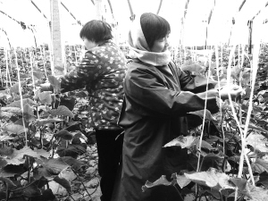 昨日,两名农妇正在大棚内精心管理黄瓜。为搞好春季大棚黄瓜生产,开春后,周口各地农民积极投入到大棚黄瓜管理中,以期取得更好的经济效益。(记者 孙安平 摄)