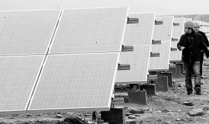 2月18日,在福建省连城县大型太阳能电站建设工地,工作人员在巡检太阳能电池板安装进度。福建连城太阳能电站一期总投资约1.3亿元人民币,设计规模为4.4兆瓦,建成后每年可提供510多万度绿色电力,是国内利用太阳能、发展绿色能源的示范性兆瓦级大型电站项目之一。新华社发