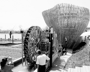 西安世园会 环保呈亮点 4月23日,游客在世园会展区参观水车。2011年西安世界园艺博览会经过两年多的筹建准备工作一切就绪,将于4月28日正式开幕,喜待八方来客。本次世园会处处彰显生态环保理念,生态环保成为世园会一大亮点。新华社发