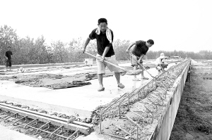 7月21日上午,工人正在西华县红花镇杜岗村贾鲁河桥施工现场紧张施工。据施工方负责人介绍,该桥预计8月初竣工,比原先预期提前三个月。该桥建成后将大大改善杜岗村村民生产生活状况。