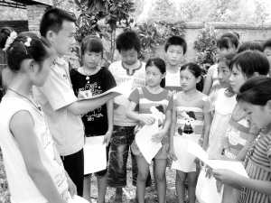 暑假期间,舒庄派出所组织民警巡回29个行政村对留守儿童进行暑期安全教育,并实行民警分片包干责任制,确保留守儿童暑假期间安全。图为商水县舒庄派出所副所长党群峰在三所楼村向留守儿童讲解暑假安全防范知识。