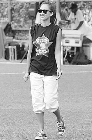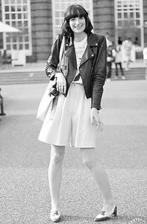 中性的机车夹克配合黑白图案的白T恤酷劲十足,但似乎少了些女人味。这时甜美的肉粉色五分裤就填补了这一空白。 |