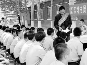 “八一”前夕,川汇区司法局工作人员和普法志愿者组成普法宣传队,到周口武警支队直属大队开展普法宣传、法制讲座和法律咨询活动,受到武警官兵的热烈欢迎。图为该局工作人员为官兵发放宣传材料。