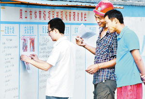 ▲昨日,两名工程施工人员正在看市体育场现场管理信息。该项目是今年我市确定的十五项重点基础设施项目之一,建设方从多方面加强管理,确保工程质量、工程进度和施工安全。(记者 沈湛 摄)