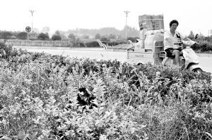 昨日,在东新区一些主干道上,记者看到由于疏于管理,道路两旁的绿化带和人行道杂草丛生,影响了市容市貌。图为周口大道绿化带内野草长得比绿化植物还高。