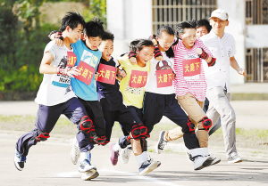 8月11日,6名小选手在参加“6人7足”比赛。当日,浙江余姚市大岚镇举办首届“阳光伙伴”青少年暑期趣味健身运动会,开展了滚铁环、6人7足、转呼啦圈、跳绳等比赛项目,让青少年在运动中享受快乐。新华社发