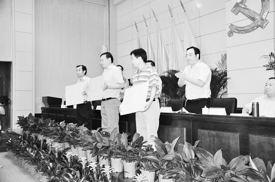 近日,川汇区召开上半年人口和计划生育工作会,图为区领导为计生先进单位颁奖。 (杨玉洁 常鸣 摄)