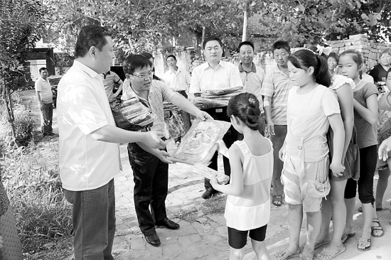 为了深入开展留守儿童关爱工作,切实促进留守儿童健康快乐成长,暑期以来,太康县税务部门工作人员积极开展“爱心助成长,留守不孤单”暑期社会活动,把更多的关怀和温暖送给留守儿童。图为该县税务人员为留守儿童送书包。(王青俊 程辉 摄)