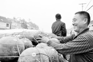 听说有记者来采访,正忙着往车上装西瓜的赵隆杰连忙放下手中的活和记者攀谈起来。