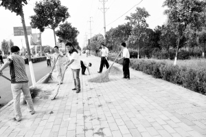 日前,沈丘县委、县政府号召县城全体居民携起手来共建文明县城,社会各界纷纷响应,积极投入创建活动,到所分包路段参加创建省级文明县城义务劳动活动。在劳动现场,锄杂草、扫垃圾、拉线……他们挥汗如雨,净化、美化县城面貌,通过几天努力,县城的面貌焕然一新。图为8月15日下午,县委办公室工作人员正在清扫街道。