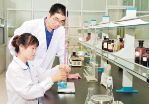 如今,项城市产业集聚区内入驻的企业越来越多,效益越来越好,规模越做越大。图为一企业员工正在进行新产品理化检验。(牛立坡 摄)