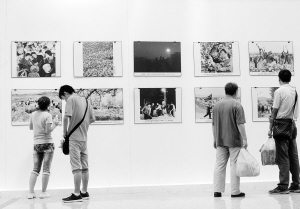 8月21日,几位观众在观看吉林省农业60年回顾图片展。