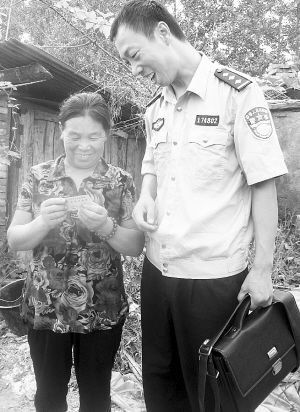 昨日,商水县郝岗乡派出所民警喻国望把身份证送到群众手中。全省优秀户籍民警喻国望担任户籍工作10多年来,坚持每周五下村走访送证,受到了群众欢迎。