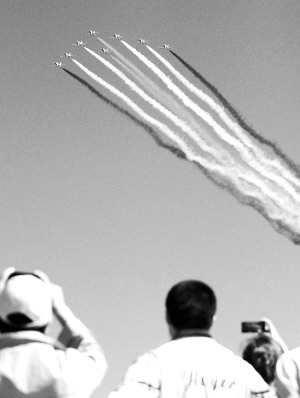 9月1日,观众在拍摄“红鹰”飞行表演队。当日,空军航空大学开学典礼暨吉林长春首届航空开放日在长春大房身机场举行,3支飞行表演队与2支跳伞表演队共舞蓝天,吸引了2万名观众在现场观摩。当日的跳伞表演,由空军航空大学航空救生系教员组成的“蓝鹰”跳伞队与空军跳伞运动大队共同完成,“蓝鹰”跳伞队也是首次亮相。