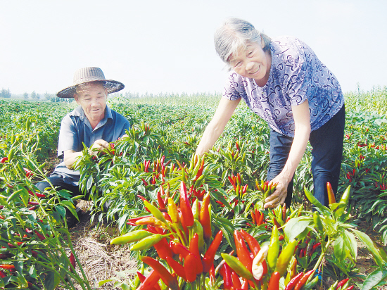 图为商水县袁老乡王庄村杨秀英夫妇正在查看辣椒长势。杨秀英夫妇今年种植了2.5亩辣椒,预计可以收入1万余元。(刘飞摄)