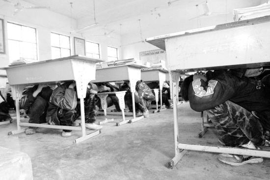 11月9日,符草楼镇一中学生在做防震应急演练。当日,太康县防火防震应急疏散演练现场会在符草楼镇一中举行。县政府办、符草楼镇、县教体局、县消防大队、县科技局等部门负责同志和23个乡镇抓安全生产工作的副职、中心校校长及部分中小学校长参加了会议。(张振 摄)