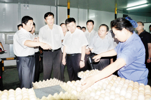西华大用肉鸡产业化项目计划总投资20亿元,目前已完成投资7.3亿元,肉鸡屠宰加工厂制冷设备已安装完毕,生产设备正在安装,孵化厂设备已全部安装完毕并投入使用。该项目建成后,年产值可达60亿元,提供就业岗位1.5万个。刘世锦走入孵化厂,认真察看肉鸡鸡苗孵化、防疫、筛选等工序,并向企业负责人询问产品的销售形势。他说,要充分发挥资源优势,在发展农产品加工业上大做文章、做大文章,着力拉长产业链条,进一步提高农产品的附加值;要强化要素集聚,加强产业集聚区建设,打造承接平台,培育主导产业,最大限度地发挥产业集聚区的综合效应。