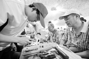 7月7日,来自杭州市拱墅区志愿者协会的志愿者在“避暑洞”里为市民免费维修小家电。